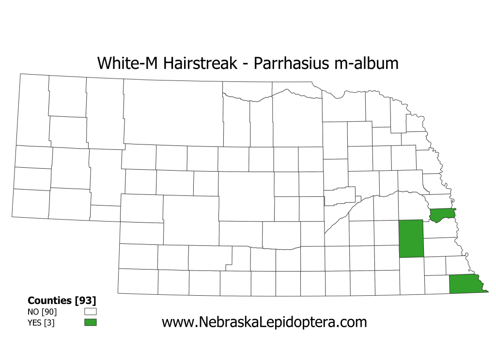 This butterfly is widely distributed in eastern North America, with breeding populations being documented nearby in Iowa and Missouri. It’s larvae feed on oaks (Quercus). It’s status (stray, breeding stray or resident) in Nebraska is unknown at this time. At first glance it might be mistaken as being a Gray Hairstreak. So, if you live in/visit southeastern Nebraska and are near oak trees be aware of the possibility of finding it. With so few records each sighting is significant. Great find Eli!!