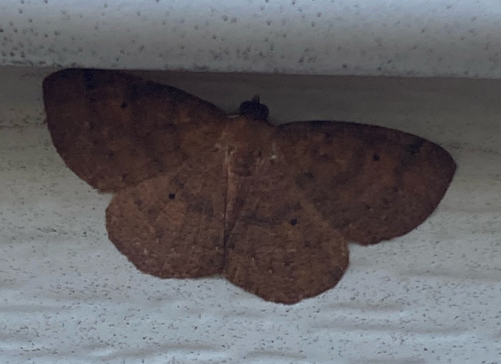 Back on October 17th Eli Weber was visiting his grandparents in Cuming County when he found an usual moth resting on their garage. After doing some research. he identified it as a Black-dotted Ruddy Moth. This id was verified by Mark Brogie, Nebraska’s resident moth expert. This is a new species for the state, the next nearest record being from northeastern Oklahoma. Larvae are reported to feed on Hollies (Ilex species), none of which are native to the state (but may be present as ornamentals). Great find Eli!!