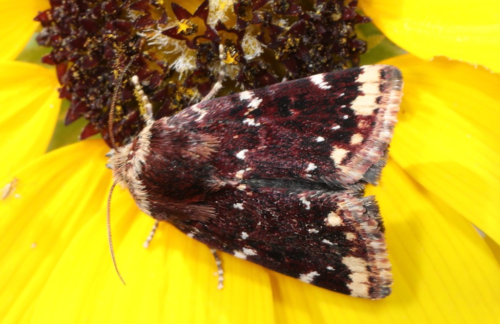 A new flower moth has been found in Nebraska. In August Brad Bolduan was visiting Valentine National Wildlife Refuge when he photographed several moths visiting sunflowers. After circulating his photos it was a consensus of several experts that the moths he found were Schinia avemensis. This moth is rarely found in the United States (two records from southern CO), with other records being from southern Canada. BugGuide reports the larval host plant to be prairie sunflower (Helianthus petiolarus) which is widespread across the western United States, including western portions of the Dakotas, Nebraska and Kansas. Many thanks to Brad for his diligence in circulating his photos and getting them identified.