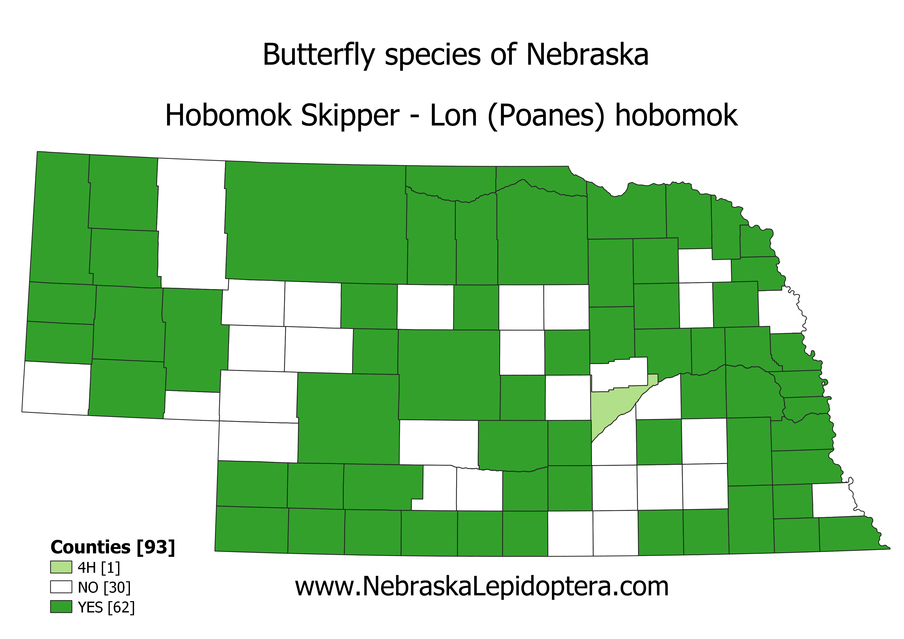 Range: The Hobomok Skipper inhabits a large area from central Saskatchewan to the East Coast and south to the Carolinas and Missouri. It occurs statewide in Nebraska.